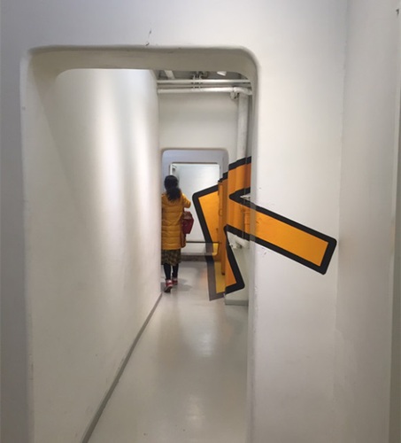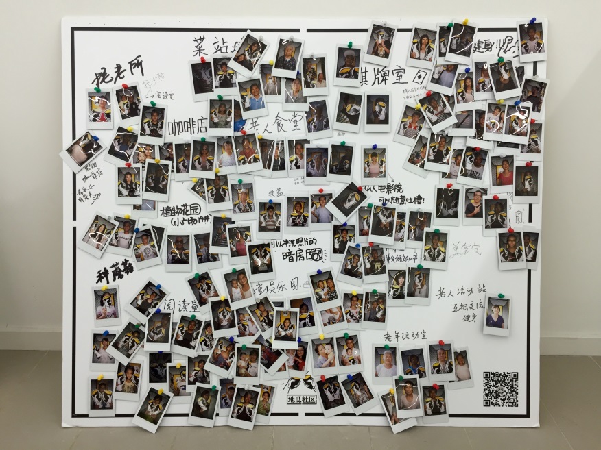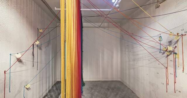 两侧墙面绘着中国地图,从天花板上垂下彩色的绳子,参加的人拉一根绳子找到自己的家乡,写下“我是、我能、我想”。如果有人想交换技能,就会拉起绳子的另一端。经过数次的交换,垂落的晾衣绳像伞一样慢慢张开,象征着人与人之间的隔阂的“墙”被打破,拉成了一个屋顶的形状,所有人同在一个屋檐下。