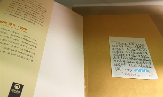 图书馆里是居民们捐赠的图书,他们不只是拿出闲置书籍,还会分享阅读的故事。翻开一本《乌合之众》,扉页上贴着标签,写着原主人的读后感,并留下了联系方式,期待与下一位书友的交流。