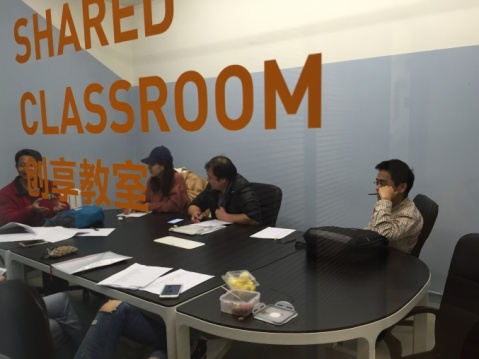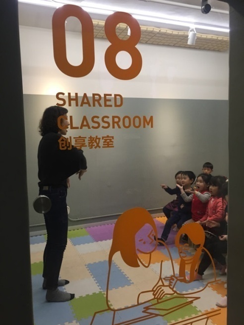 傍晚时分,人渐渐多了起来。下班的大人、放学的孩子们来了。这时,创享教室利用起来了,一边是一位全职妈妈在教孩子们唱英文歌,一边是一位中年男子在教感兴趣的邻居学英语。