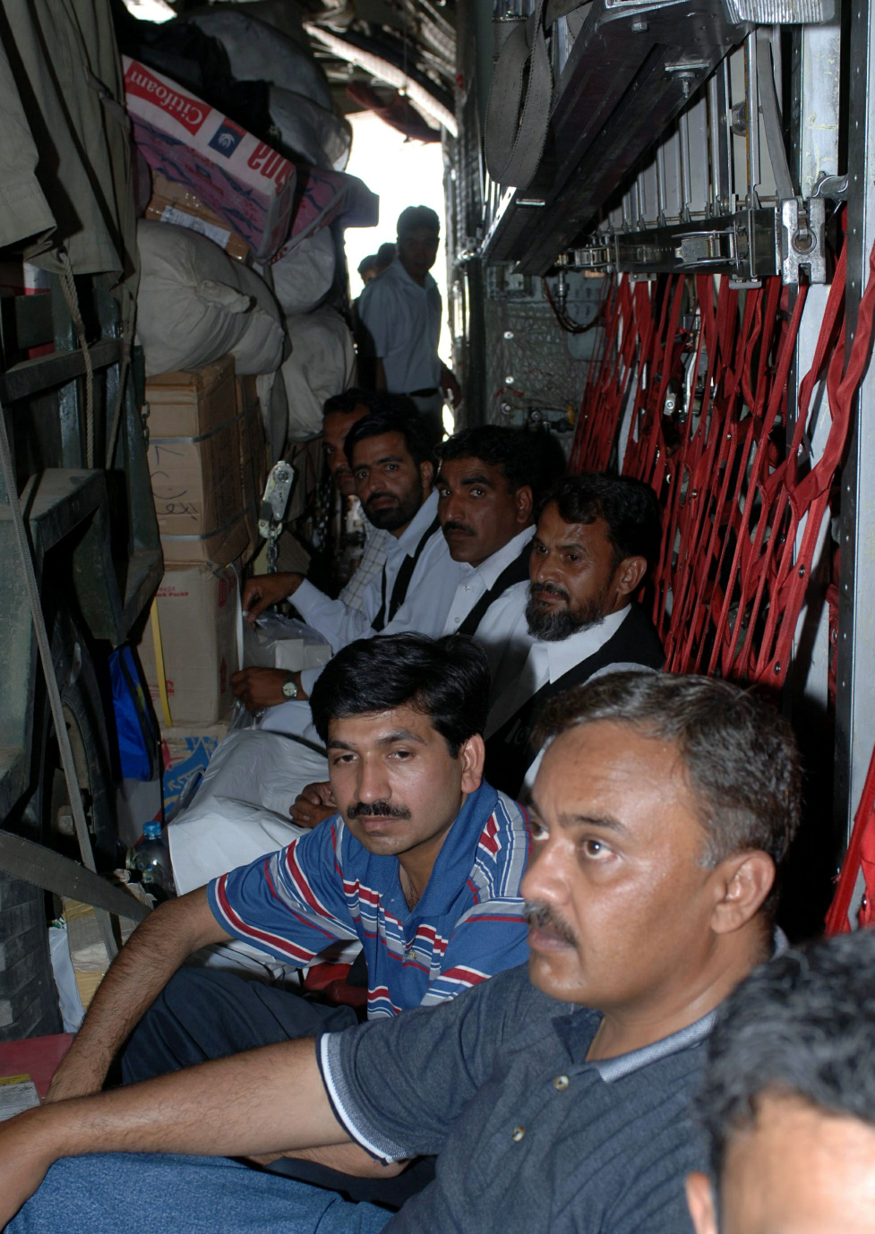 2008年5月27日,在巴基斯坦首都伊斯兰堡郊外的杰格拉拉空军基地,巴基斯坦医疗队队员坐在满载医疗设备的机舱里,准备奔赴中国甘肃地震灾区。当日,巴基斯坦医疗队首批28名队员带着医疗设备搭乘两架巴空军运输机前往中国甘肃兰州。(新华社发)