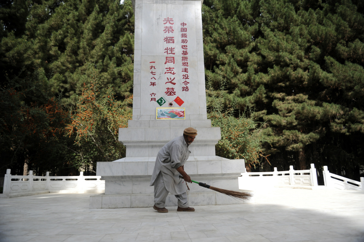 2015年3月25日,在巴基斯坦北部城市吉尔吉特东郊丹沃尔村,阿里·艾哈迈德在打扫中国烈士陵园。(新华社发)