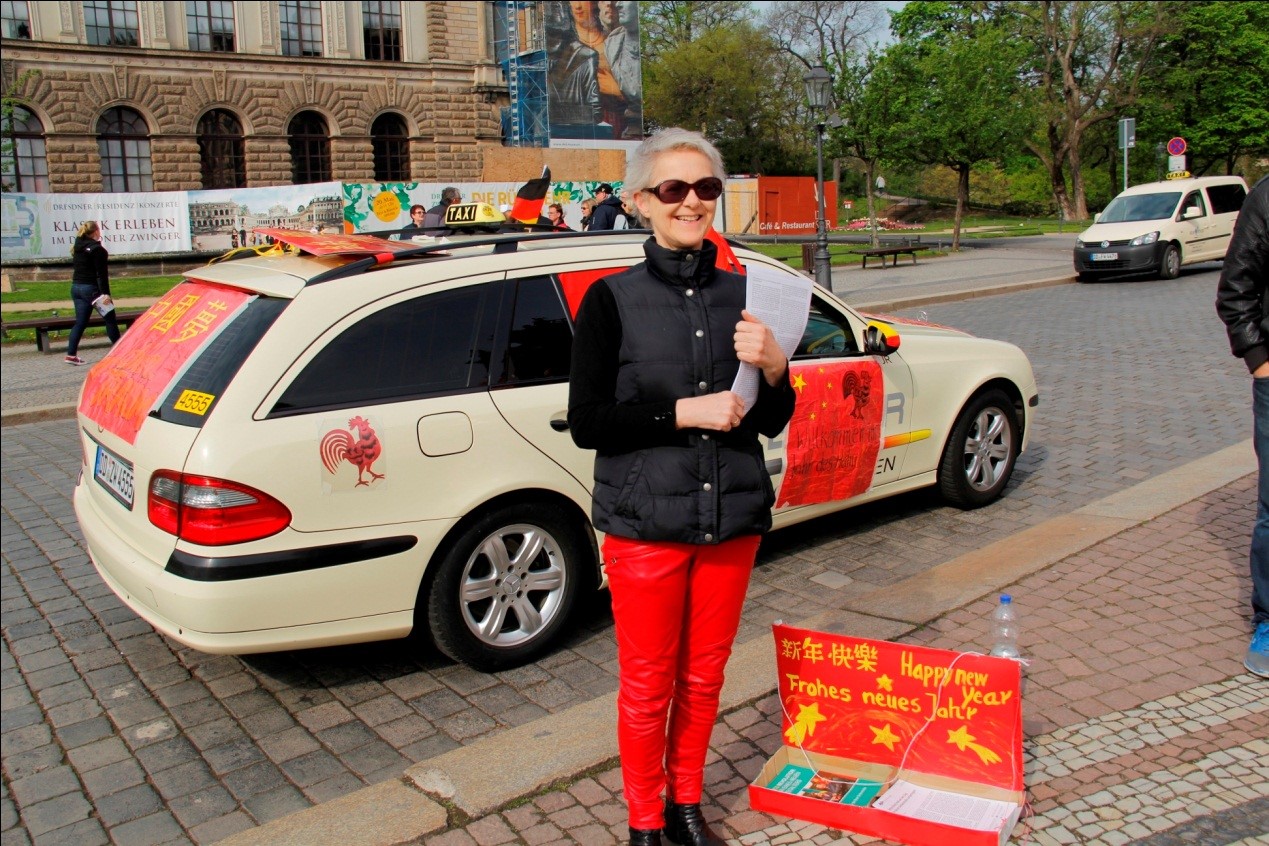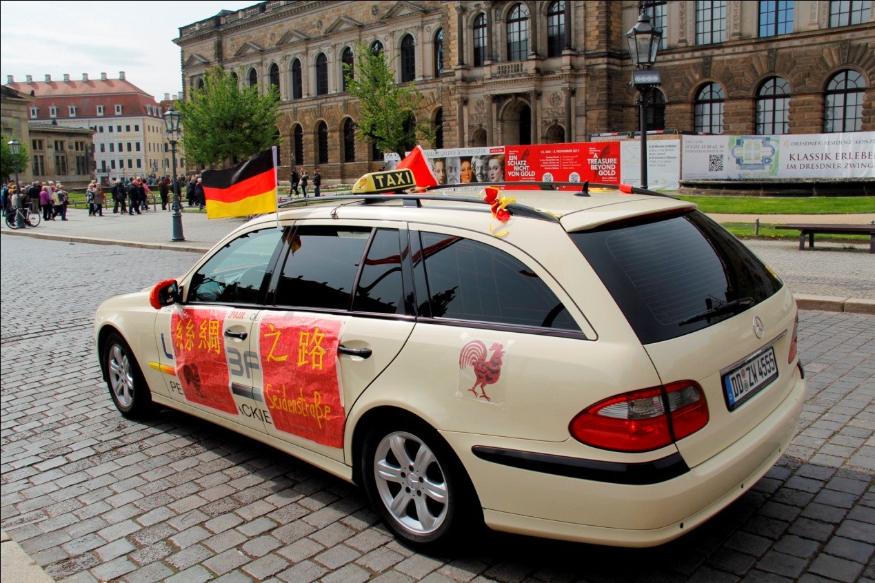 德国东部城市德累斯顿有一辆特殊的出租车,当然我要说的可不是它的车标(三叉星),而是它的扮相。车身两侧插着中德两国小国旗,顶上竖着中德双语写就的“丝绸之路”标语,车身后同样贴有双语标注的“中国梦”宣传,车门上还挂着一面“ 一带一路”的旗帜——全部都是鲜明的中国红。