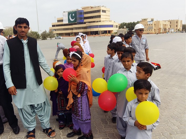 纳西姆(左)和“中国小学”的学生们在瓜达尔港参加活动时合影留念。