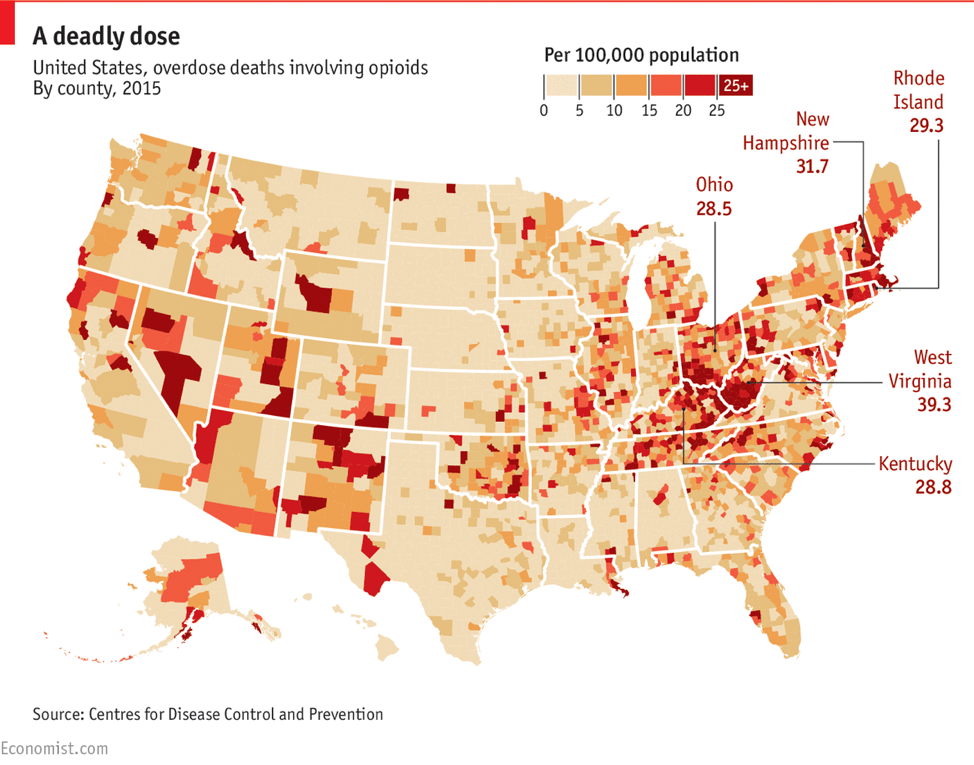 英国《经济学家》杂志绘制的美国阿片类药物过量使用致死地图
