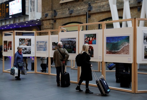 2018年12月10日,在英国伦敦国王十字火车站,人们驻足观看“变革与梦想——中国改革开放40年”图片展。新华社记者韩岩摄
