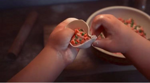 故事发生在一个典型的华人家庭,一个女人正熟练的擀着面皮,做着包子。
