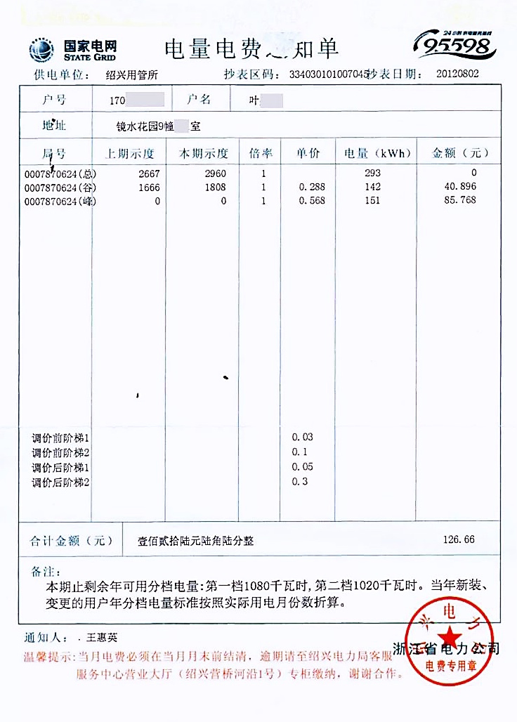 2012年,绍兴市居民用电到户电价,按年用电量划分三档阶梯式累进加价。8月当月,这户居民的用电量总293度,合费为126.66元,平均每度为0.432元。2016年3月,当月用电量总320度,合费为133.04元,平均每度为0.415元。