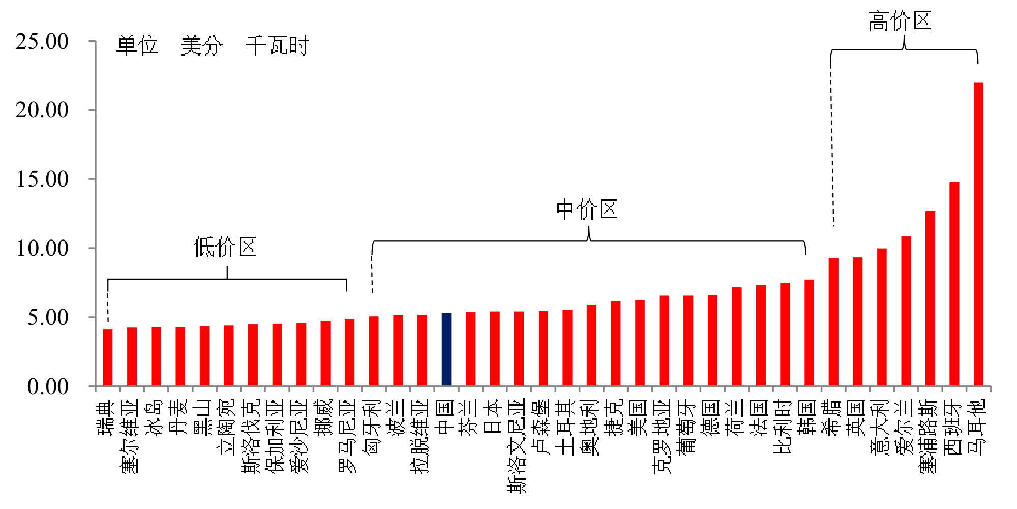 其中,高于8美分的有西班牙(14.8美分)、意大利(10.0美分)、英国(9.3美分)等7个国家;5~8美分的有韩国(7.2美分)、法国(7.3美分)、德国(6.6美分)、美国(6.2美分)、中国(5.3美分)等19个国家;低于5美分的有挪威(4.7美分)、丹麦(4.3美分)等11个国家。