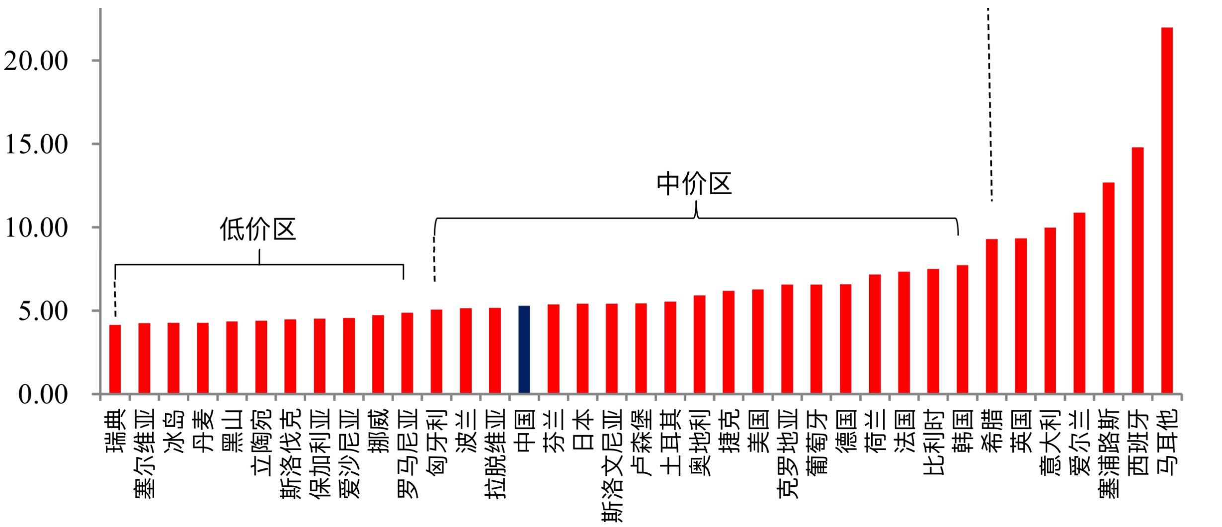 其中,高于6美分的有荷兰(8.1美分)、德国(7.3美分)、丹麦(6.3美分)等8个国家;位于4~6美分之间的有法国(5.7美分)、日本(5.6美分)、英国(4.7美分)、美国(4.3美分)等19个国家;低于4美分的有希腊(3.7美分)、意大利(3.7美分)、中国(2.8美分)、韩国(1.9美分)等10个国家。