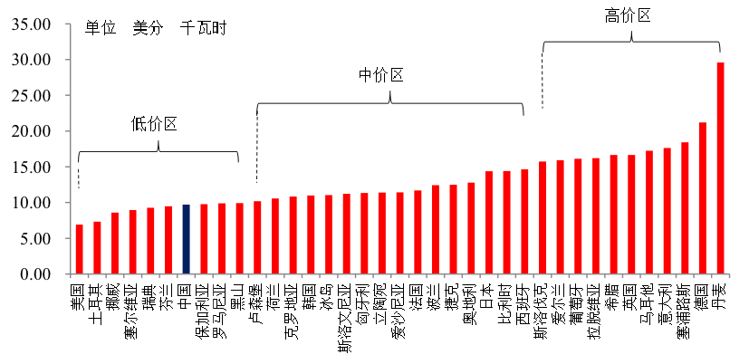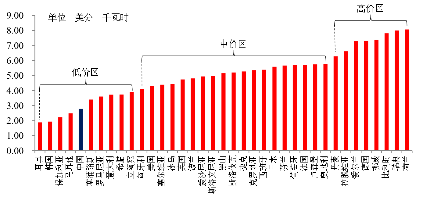 低价区:低于10美分,主要有中国(9.7美分)、芬兰(9.5美分)、美国(6.9美分)等10个国家。我国工业电价为倒数第7位,也是比较低的。