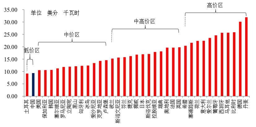 37个国家平均销售电价为每千瓦时17.5美分,分布区间为9.2美分(土耳其)~31.9美分(丹麦),相差3.5倍,按水平高低分为四个区间。