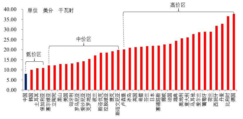 从居民电价来看,37个国家平均为20.6美分,分布区间为8.0美分(中国)~37.7美分(德国)。