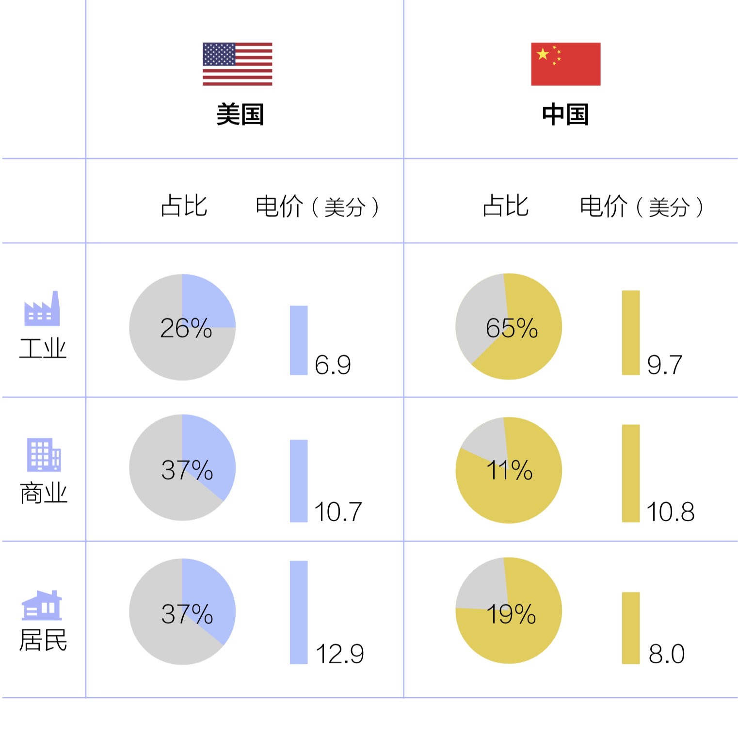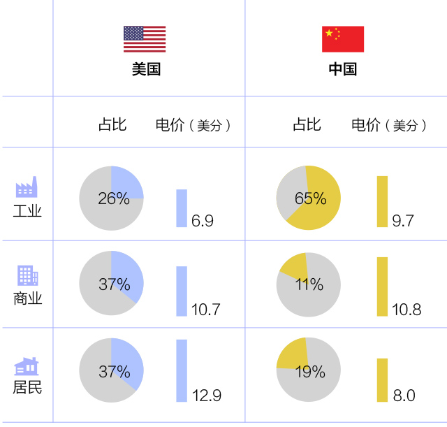 理论上,工商业用电的电量大、电压高、成本低,电价应低于居民农业用电。美国是典型发达国家,居民用电占比大、价格高,工业用电占比小、价格低。