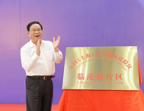 今天上午,上海市委书记李强在临港办公中心为中国(上海)自由贸易试验区临港新片区揭牌。陈正宝 摄