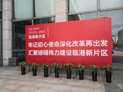 红红火火,喜气洋洋。临港新片区揭牌会场前标语鼓舞人心。