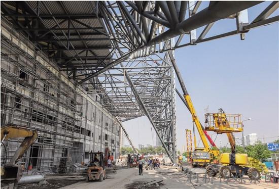 记者昨天来到绍兴国际会展中心项目施工现场,看到800多名工人正在对一期B区场馆内部和立面进行紧张施工。
