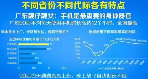 移动网络是90后的“生活必需品”。搜狗输入法大数据团队和共青团中央联合发布的《中国青年网民网络行为报告 (2016-2017)》显示,90后日均上网时长为6.5小时,80后为6.2小时,高于70后4.1小时和00后的3.6小时。爱尔眼科和一点资讯在2018年联合发布的《国民手机用眼行为大数据报告》显示,手机是90后上网的重要工具:90后男生每天使用手机时长在6小时左右,90后女生每天使用手机时长在10小时以上,广东、浙江、江苏、上海、北京90后的日均上网时间超过了11个小时。