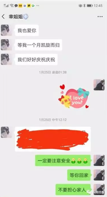 1月23日,因疫情严峻,妻子朱子幸接到单位通知成为湘阴县人民医院首批护理应急小组成员并立即投身防控疫情工作。这也意味着,他们夫妻二人不能一起过春节,也不能一起吃团圆饭,甚至来不及碰面互相叮嘱就进入抗疫一线战斗。汤思奇负责高速公路路面巡逻与岳阳收费站防疫检查点协助当地疾控部门检查,妻子朱子幸则是在隔离区一线照顾病患。24日,下午4时许。正值万家灯火团圆时的除夕,忙了一天工作的汤思奇趁着短暂的休息,拿出手机给妻子朱子幸在微信上转去两个充满爱意数字的红包。“加油!宝宝!心态要好,才会健康。我晚上也要去执勤了,我会注意的”“安好,勿念。你自己也要注意身体。”夫妻二人在通过简短的叮嘱后,又各自奔赴自己的岗位。汤思奇一直到晚上8时才开始短暂修整。