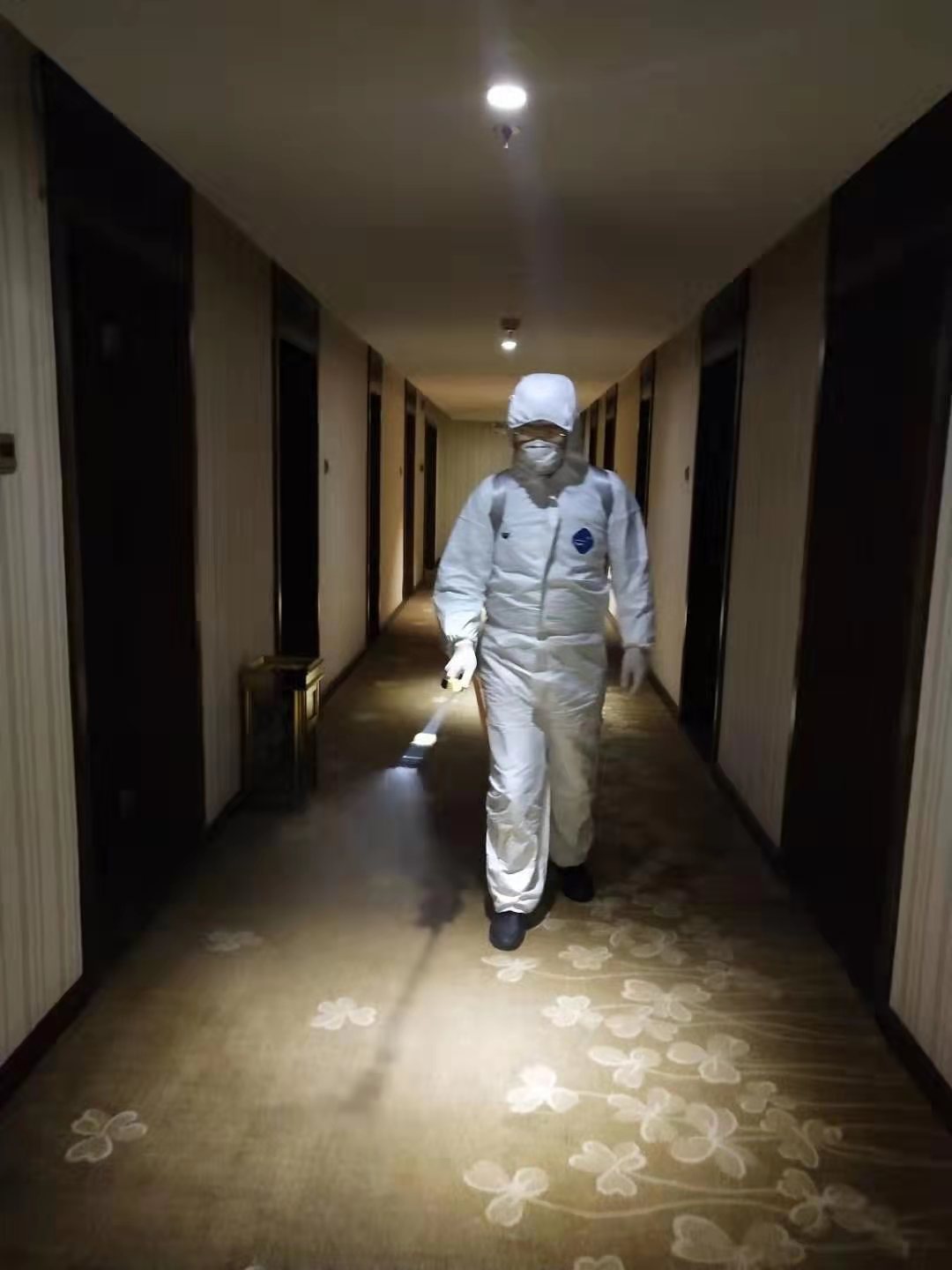 安置宾馆全天24小时有专门的医护人员值守,他们身穿防护服,佩戴口罩、护目镜,为酒店内的旅客测量体温,定时通风消毒。 “只要有来酒旅客入住,楼道、房间、通道我们全部要消毒,从1月28日进入宾馆以来,我和另一名值守的医护人员已经三天没睡过一个完整觉了。”在酒金东路的另一家安置宾馆内,值守医护人员马伟说:“我是主动申请到一线来的,我们的工作就是为入住的每一位旅客不定期地测量体温,讲解新型冠状病毒感染的肺炎预防知识。”