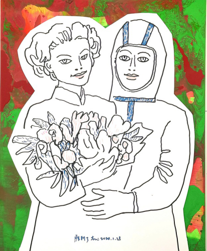 这是一组5幅由速写与抽象画面构成的作品,创作者精心选择了5个场景:《上前线》,是护士进入治疗现场戴上手套的瞬间,冷静而投入;《争分秒》,武汉火神山、雷神山医院建设过程的画面截影;《有大爱》,是社区义工、居民志愿者对居家隔离者的关心与帮助;《战死神》,医护人员与病人之间的典型画面;《出院了》,底色明亮、怀捧鲜花、充满希望。