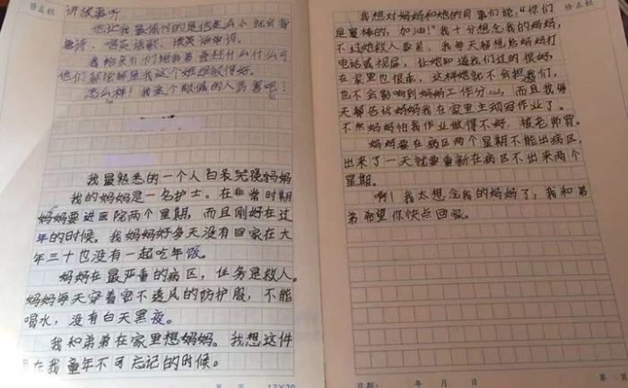 家里一切安好,这些天孩子们都很乖,俩孩子喊着口号“妈妈你是最棒的,你们加油!你快点回来,要记得带饼干给我们吃!”本以为女儿不清楚妈妈在干什么,直到她拿给我作文本:“妈妈在最严重的病区,任务是救人,不能喝水,没有白天黑夜……”这是她写给妈妈的《我最熟悉的一个人,白衣天使妈妈》,我感觉很欣慰。晚上把孩子写好的作文发给妻子,也算精神上的一种鼓舞。我知道她每天在承受着巨大的压力,可以说是身心疲惫,达到了极限;但是,在这个非常时期我只能不断地鼓舞她要挺住……