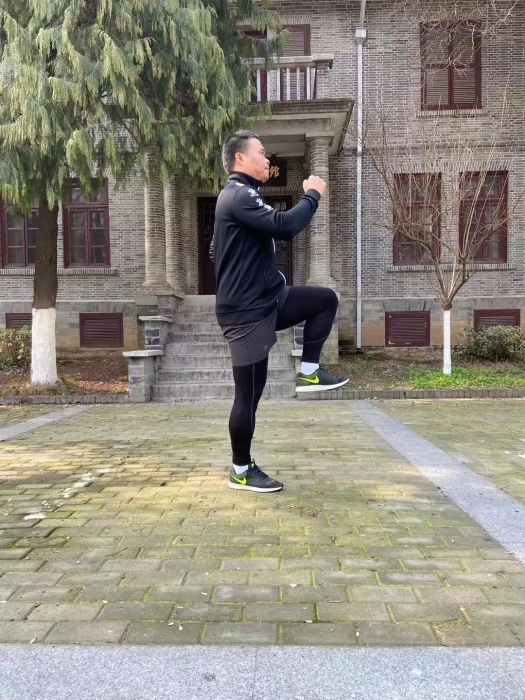 抬头、挺胸,身体保持正直。大腿面抬起和地面平行,摆臂幅度要大。