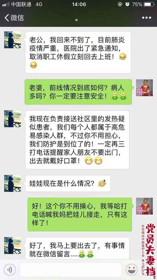 “老公,我回来不到了,目前肺炎疫情严重,医院出了紧急通知,取消职工休假立刻回去上班!”“老婆,前线情况到底如何?病人多吗?你一定要注意安全!”“我现在负责接送社区里的发热疑似患者,我们每个人都属于高危易感染人群,不过你不用担心,我们防护是到位了的!一定再三打电话提醒家人朋友不要出门,出去就戴好口罩!”……
