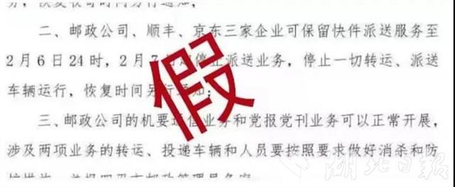 中国邮政对外承诺疫情期间“四不中断、四免费办”,其中包括揽投服务不中断,保证各类邮件揽收投递。顺丰辟谣称,“顺丰小哥一直在线”。京东方面表示此消息不属实。(湖北日报来稿)