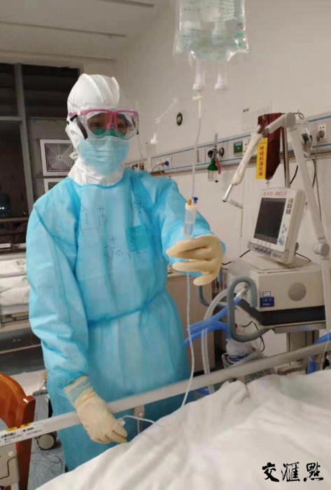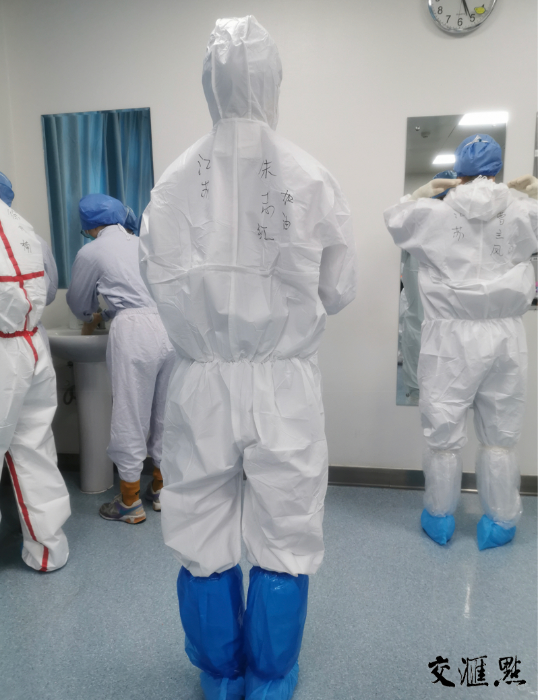 南通大学附院重症医学科主管护师侯亚玲:穿防护服,更衣室面积不小,却满满当当,伙伴们迅速有序地各自穿着防护服,隔离衣,一层,两层,护目镜、防护屏,一样也不能少。穿戴完成,只有衣服上的汉字提醒着我们你是谁。尽管是临时改建的病房,每一个门关都很重要,我们相互提醒,仔细认真。