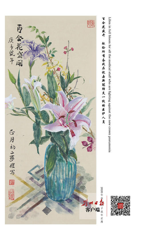 在我市“抗疫战”打响后,在家的他第一时间创作了《致最美逆行者》《致敬钟南山院士》《春天花会开》《百合花盛开》等组图,其中他将《百合花盛开》作品专门献给所有奋战在抗击新型冠状病毒肺炎一线的医护人员。