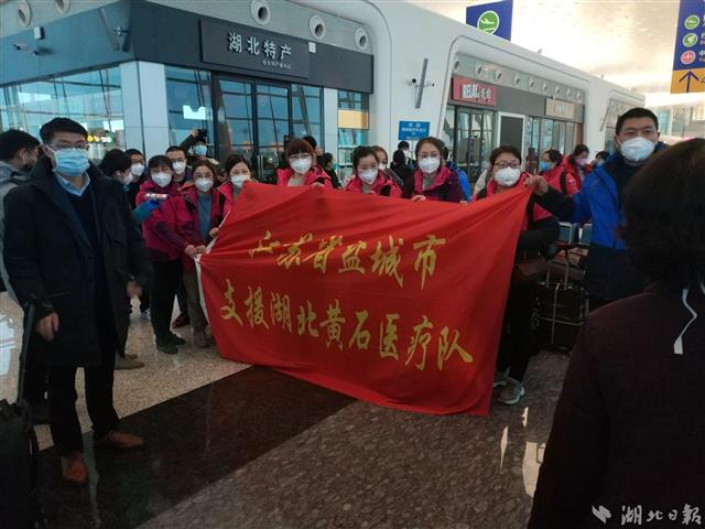 黄石市副市长李丽在武汉天河机场迎接江苏省医疗队新一批队员到来。她说,此前江苏省医疗队已在黄石开展工作,作出了积极贡献,“我们一定给医疗队提供最好的后勤保障,随时有热水,随时有热饭,生活无后顾之忧。”
