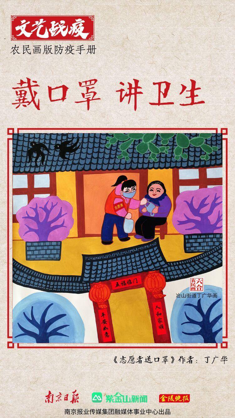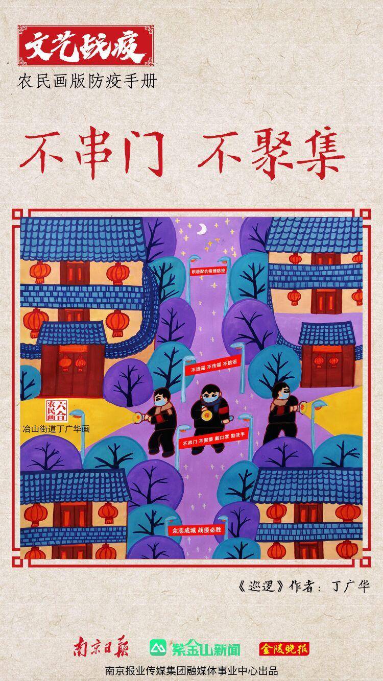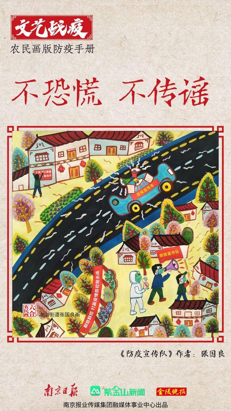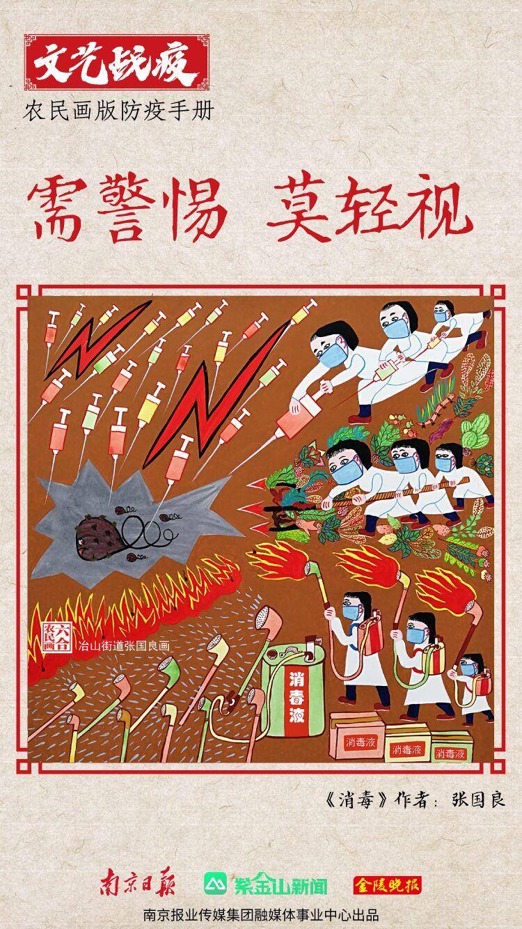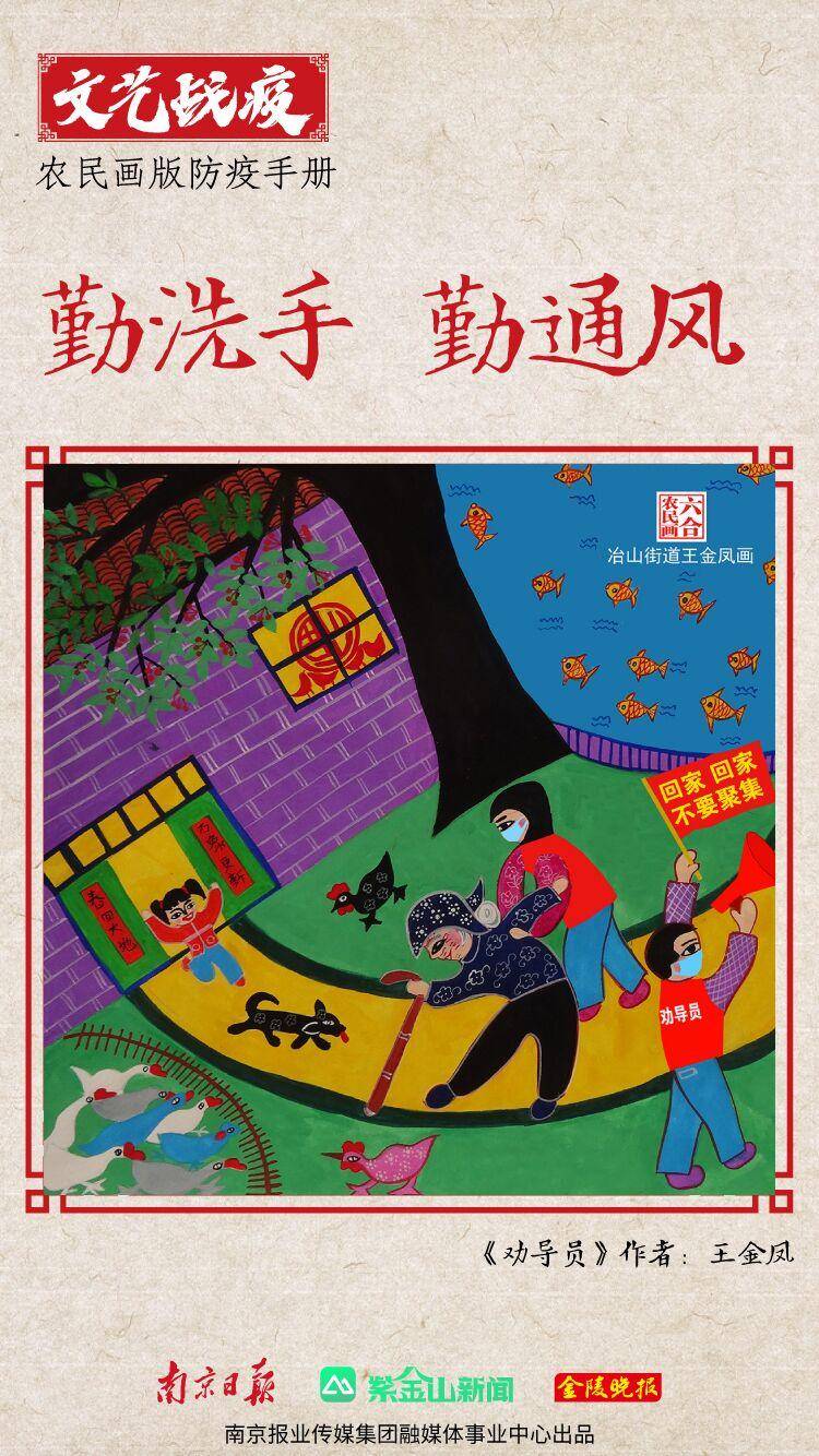 “我们的创作,从大年初二就开始了。”六合区冶山街道文体服务中心主任、农民画作者胡斌说。他和张国良、丁广华、王金凤、王建飞等10余位农民画作者在10天时间里,创作了第一批战“疫”农民画。这些作品主要是“图说疫情防控”,提醒大家戴口罩、勤洗手、不串门、不聚集。