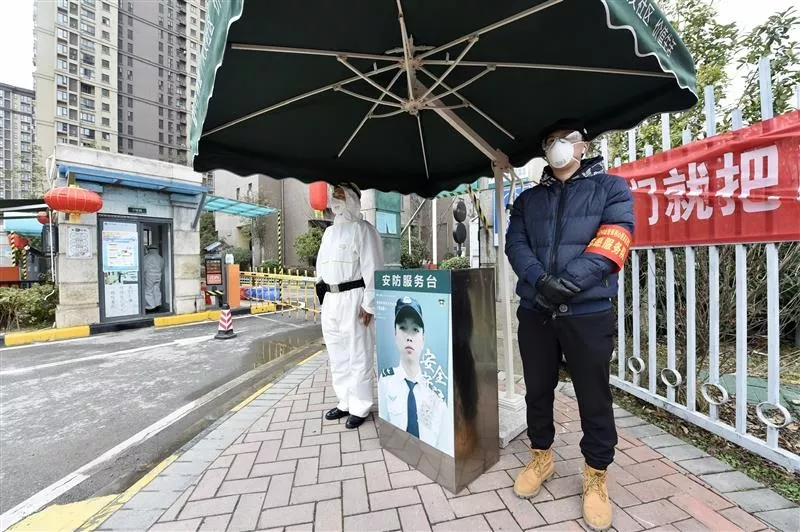 2月11日,武汉市洪山区保利心语九区,物业人员和社区党员志愿者共同把守小区大门。(湖北日报全媒记者 李溪 摄)