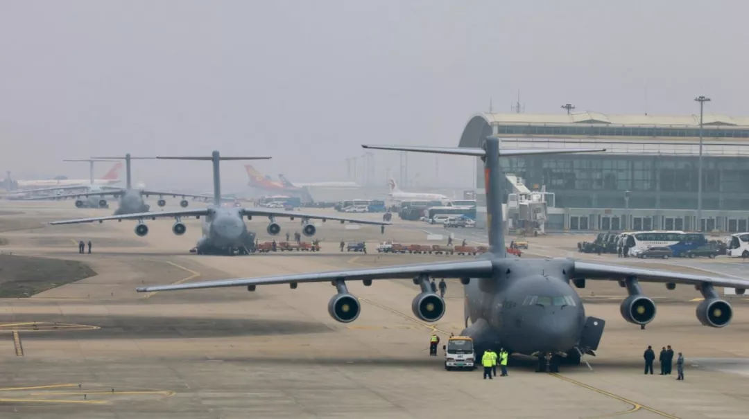 2月13日上午,11架空军运输机载947名医护人员和74吨医疗物资抵达武汉天河机场。(视界网 李伟 摄)