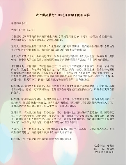 “再冷的冬天也会过去,再迟到的春天也会到来!”慰问信鼓励学生:国际邮轮工作的喜悦还未曾消失,却遇上了这肆虐的病毒;你们一定要相信有党和政府的坚强领导,有人民的坚定支持,有白衣天使们“不计报酬、无论生死”的决心……我们一定能打赢这场疫情阻击战、生命保卫战。