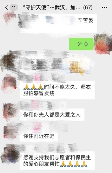 2月15日凌晨12点过,一条内容为四川一名输送物资到武汉的志愿者,因被大雨淋湿,需要一套衣服供换洗的求助信息,被转发到武汉各大抗疫志愿者群中。