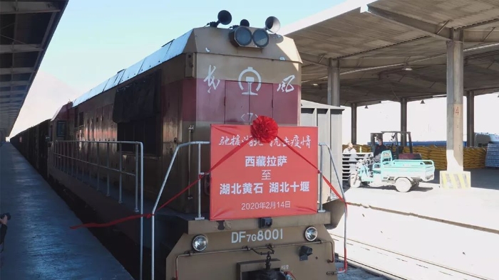 2月14日下午,西藏自治区首批驰援湖北的物资在拉萨火车站西站完成装车发车。