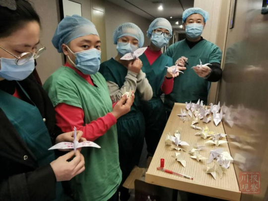 2月15日,一只只千纸鹤飞进了汉阳国博方舱医院,这是我们广元市中医院援助湖北医疗队护理团队送给病人的特别礼物。