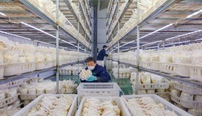 生产端 2月12日,遂宁市船山区永河现代农业产业园区菌绿农业生产车间内,工人正加紧采摘海鲜菇。 刘昌松 摄(视觉四川)