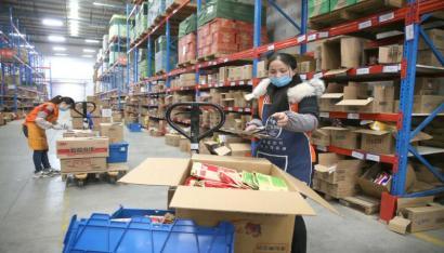 配送端 2月11日,眉山市宏远上铖超市配送中心,工作人员正在分拣货物。张忠苹 摄(视觉四川)