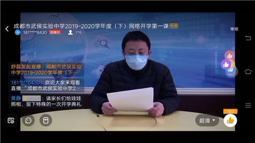 “没有开视频的同学请尽快把摄像头打开,我们马上要开始上课咯……首先,来看看田间校长和3位老师特意为大家录制的战‘疫‘教育,如果有什么感触,请及时发上来与大家分享。”2月18日8:15分,成都石室中学2020年春季的开学第一课开始了,高三5班班主任、语文老师李挚正在家中,通过电脑组织班级“纪律”。