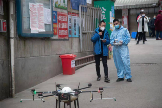 2月13日,绵阳404医院丰谷分院和一旁的丰谷镇农贸市场,搭载消毒设备的无人机同时在这两个场所进行消毒作业。无人机飞行高度约3到4层楼,在作业人员操控下精准执行悬停、喷洒等动作。“无人机一小时可消毒200亩。”现场作业工作人员唐子潇说。