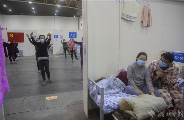 2月17日,武汉客厅方舱医院,护士带领患者集体跳健身操。(湖北日报全媒记者 柯皓 摄)