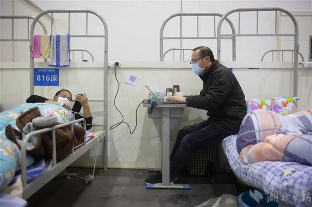 2月17日,武汉客厅方舱医院,患者在病床旁使用电脑。(湖北日报全媒记者 柯皓 摄)