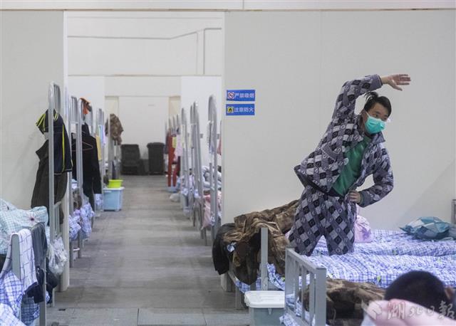 2月17日,武汉客厅方舱医院,患者在病床旁做健身操。(湖北日报全媒记者 柯皓 摄)
