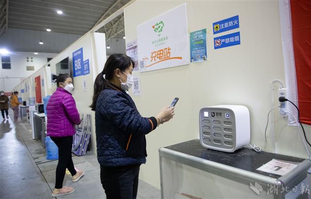 2月17日,武汉客厅方舱医院,患者在充电站扫码使用充电宝。(湖北日报全媒记者 柯皓 摄)