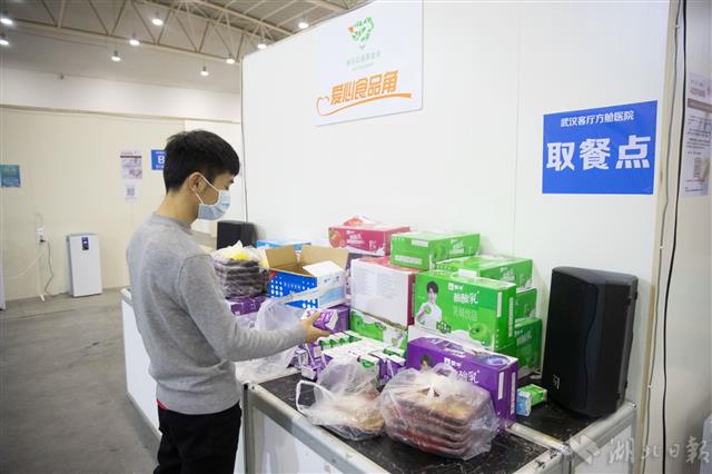 2月17日,武汉客厅方舱医院,患者在爱心食品角取用免费牛奶。(湖北日报全媒记者 柯皓 摄)