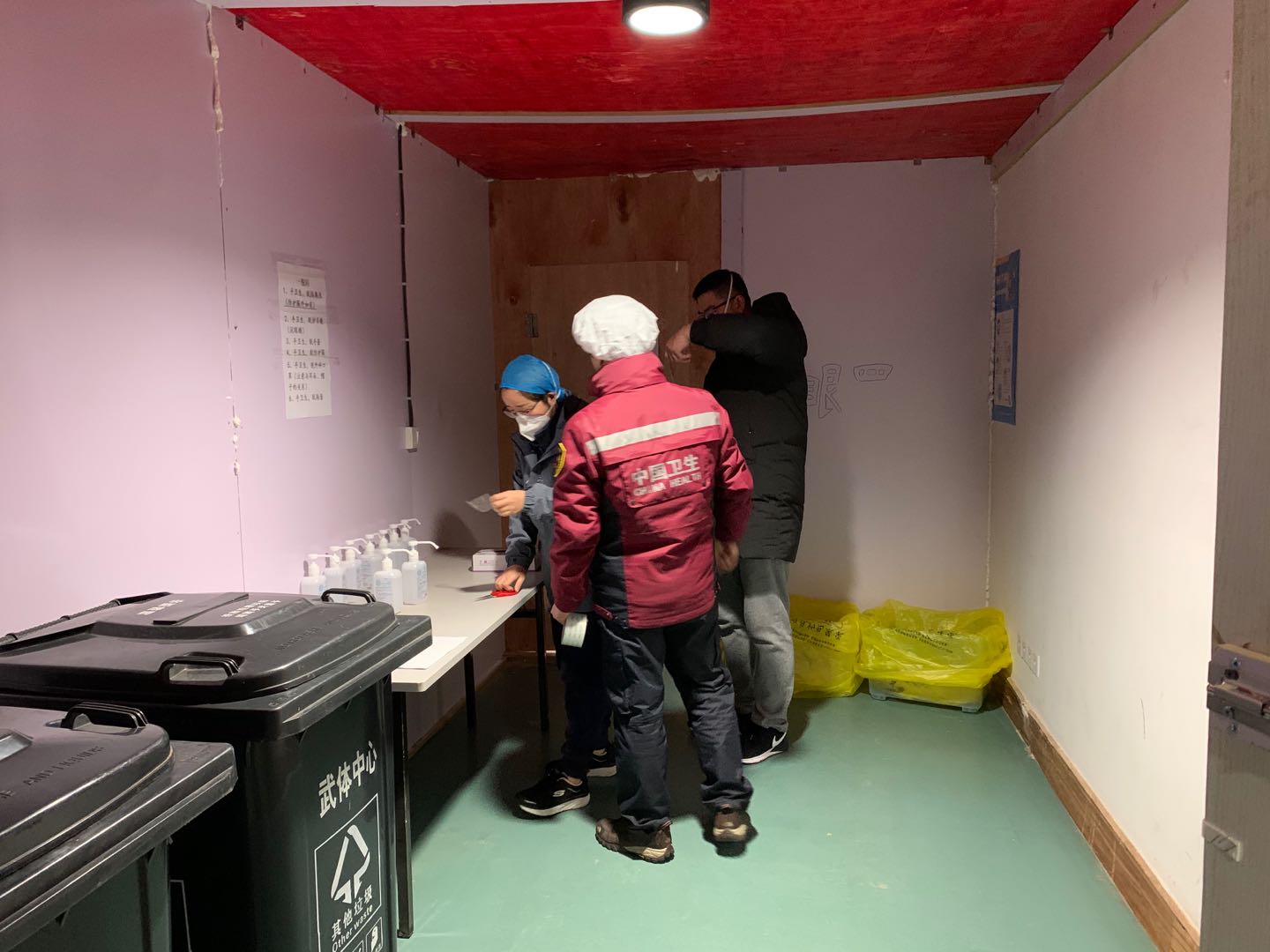 为了抢时间,所有工作人员24小时昼夜赶工建舱,尤其是对于医护人员出入舱通道处的设计和管理,南京市第二医院副院长、武汉体育馆方舱医院感控组组长杨永峰严格根据医护人员穿脱防护服流程,自己动手设计出入舱房间布局,指导装修师傅打造板间。