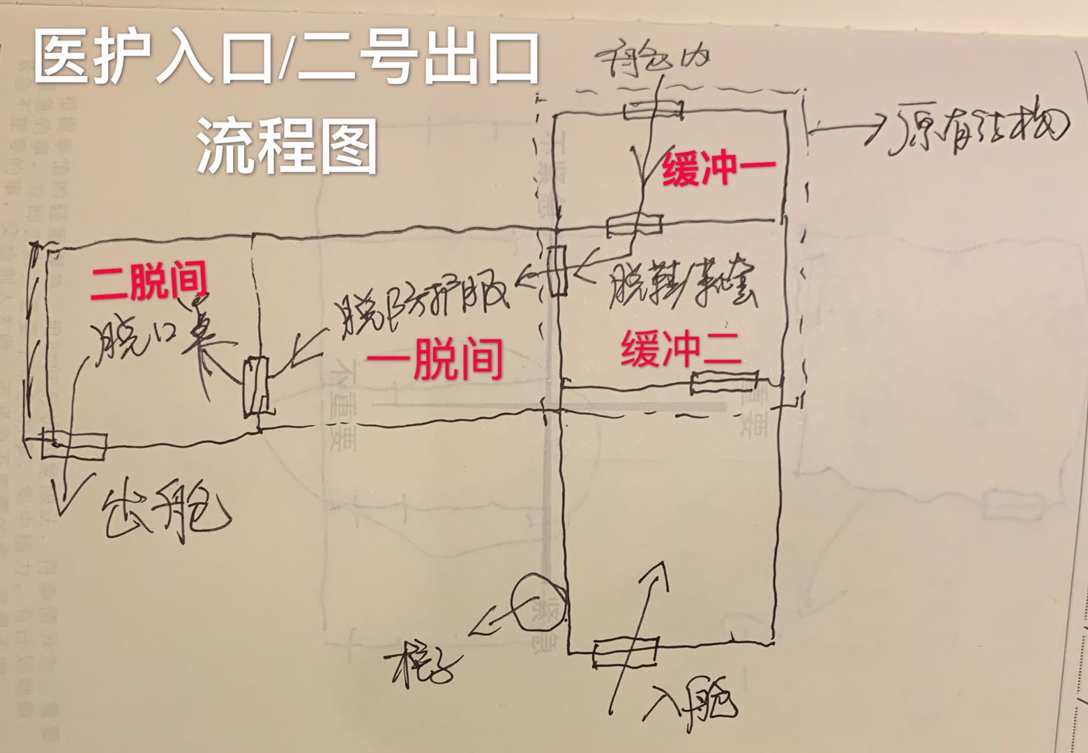 医疗队终于在12小时里,在有限的空间内,迅速打造出了两条出入舱互不相同的通道,并分别设计出缓冲间一、缓冲间二、一脱间、二脱间等合理空间。每个相邻房间设计S型出入口,避免两侧空气对流,严格避免污染区与清洁区交叉接触,减少感染机率。每个房间根据穿脱防护服流程贴好步骤流程图,详细指明在每一个房间内应该进行的穿脱操作。