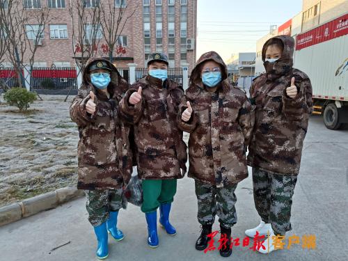龙江四姐妹在武汉沌口方舱医院里工作了 一宿,出来后互相庆祝圆满完成第一次任务。